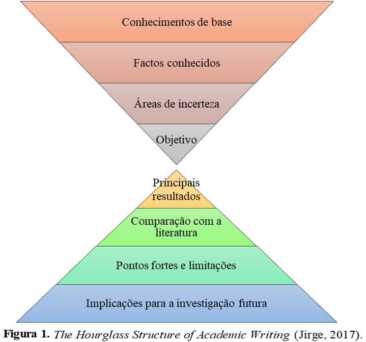 No início da escrita académica, apresenta-se informação de fundo, contexto histórico ou um enquadramento conceptual a partir de uma perspetiva ampla. Depois, a partir de uma perspetiva mais restrita, o seu argumento leva ao conteúdo do seu trabalho. O conteúdo do seu trabalho é então apresentado, sendo o mais restrito e específico em termos de alcance. Isso inclui os seus resultados e interpretações desses resultados. Em seguida, através das discussões, o alcance expande-se com os resultados de outros estudos na literatura. As conclusões e recomendações incluem as conclusões mais abrangentes para abordar toda a literatura e recomendações para os profissionais e outros investigadores. Como pode ser visto na Figura 1, a ampulheta move-se de larga para estreita e, em seguida, de estreita para larga. Cada um dos seus parágrafos deve ser específico em termos de tópico e focar numa única ideia ou ponto que apoie o seu trabalho académico. Isto é semelhante à parte mais estreita de uma ampulheta. As conclusões são onde você revisa todos os seus pontos principais e fecha o tema.