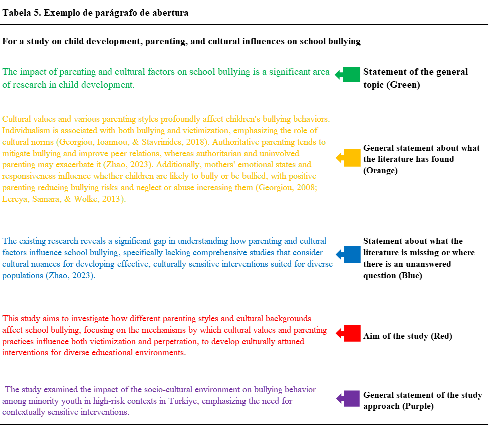 A tabela abaixo mostra como organizar a estrutura de um parágrafo de abertura de acordo com os temas do "tópico geral", "o que a literatura descobriu", "aspectos em falta ou questões sem resposta", "o objetivo do estudo" e "a abordagem do estudo". Estruturando a informação desta forma, clarifica-se o propósito, as conclusões, as lacunas e os objetivos do estudo no contexto mais amplo da investigação sobre bullying, parentalidade e influências culturais.
