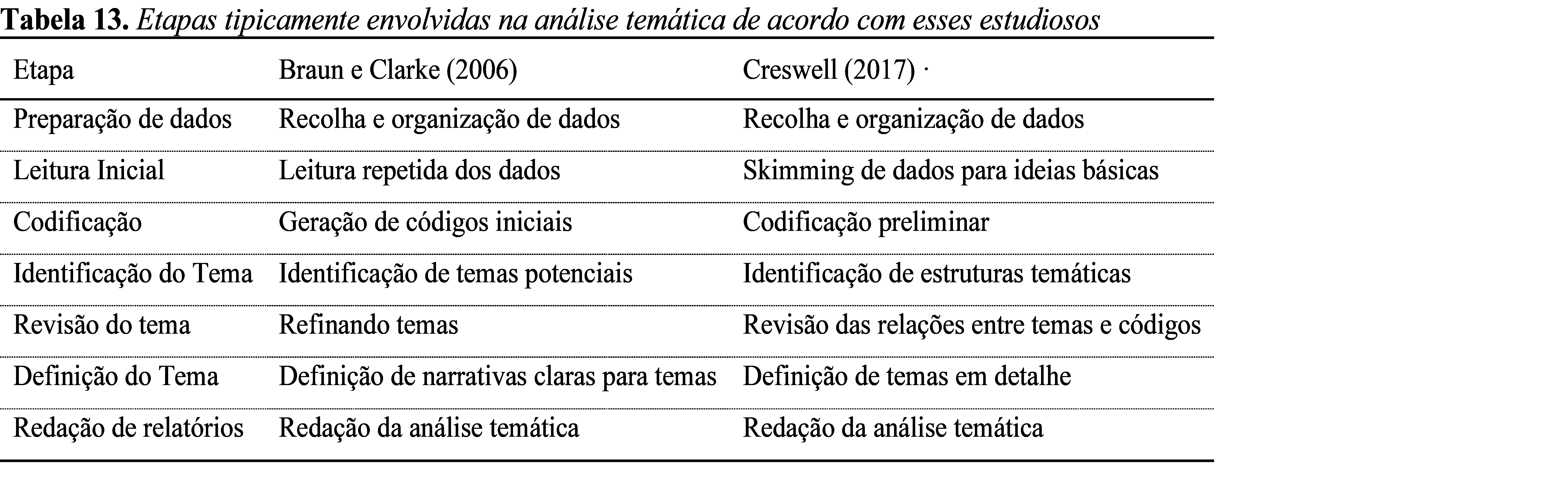 A Tabela 13 fornece uma visão geral comparativa das etapas normalmente envolvidas na Análise Temática. Existem certas semelhanças e diferenças entre as etapas propostas por Braun e Clarke (2006) e Creswell (2017). Na fase de preparação de dados, ambas as abordagens centram-se na recolha de dados e no processo de organização. Na fase inicial de leitura, a abordagem de Braun e Clarke recomenda a leitura repetida dos dados, enquanto a abordagem Creswell se concentra na identificação de ideias-chave mais rapidamente. No processo de codificação, ambas as abordagens envolvem a criação de códigos iniciais, mas a forma como este processo é implementado pode diferir entre as abordagens. Nas fases de identificação e revisão de temas, ambas as abordagens envolvem a identificação e o desenvolvimento de temas, mas os detalhes e o foco dos processos podem variar. Finalmente, na fase de escrita do relatório, ambas as abordagens envolvem a expressão da análise temática por escrito.
