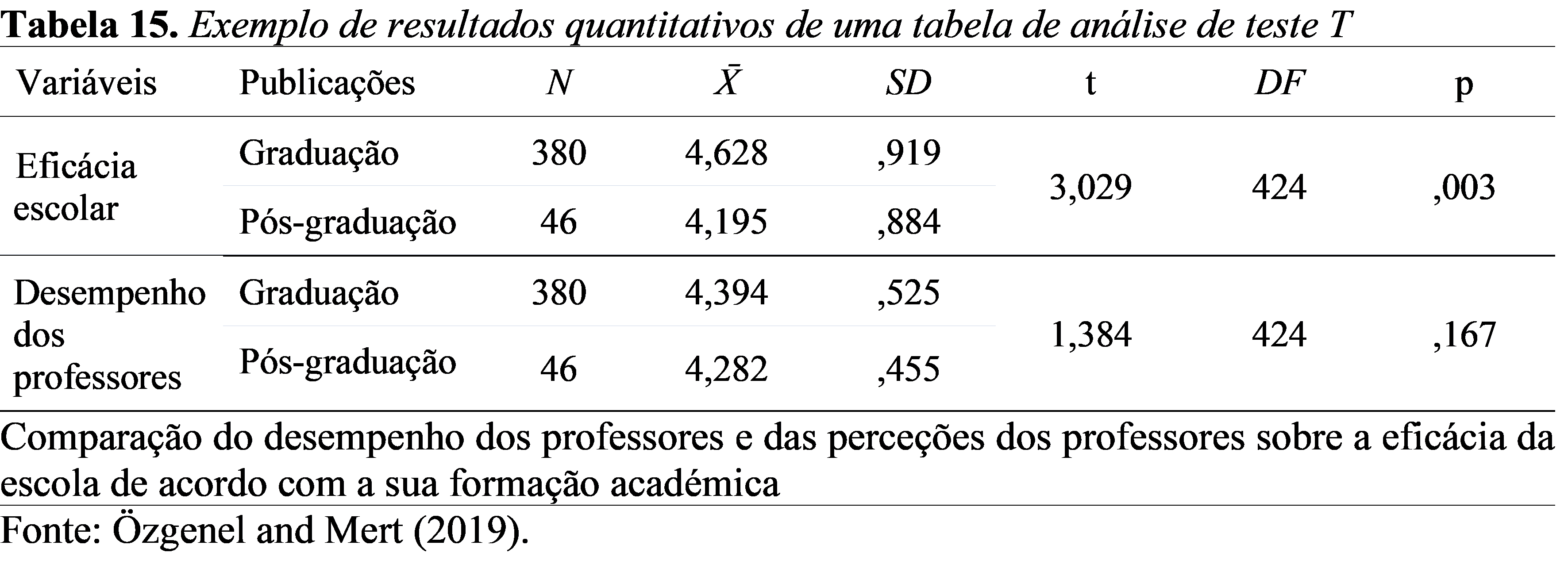 Por outras palavras, é crucial definir a importância e implicações das conclusões e alinhar-as com as questões de investigação e os estudos científicos existentes. Por exemplo, Özgenel e Mert (2019) referiram no seu estudo que, embora não tenha havido diferença significativa no desempenho dos professores de acordo com a sua formação educacional, as perceções da eficácia escolar diferiam significativamente. Em particular, os professores com cursos de licenciatura consideram as escolas como mais eficazes do que os professores com educação pós-graduada. Özgenel e Mert (2019) incluíram meticulosamente informações básicas sobre os tipos de análise e conceitos relacionados, especialmente antes de cada subsecção, evitaram expressões especulativas, utilizaram o tempo passado nos seus comentários e expressaram as suas descobertas concisamente de acordo com as questões de investigação.