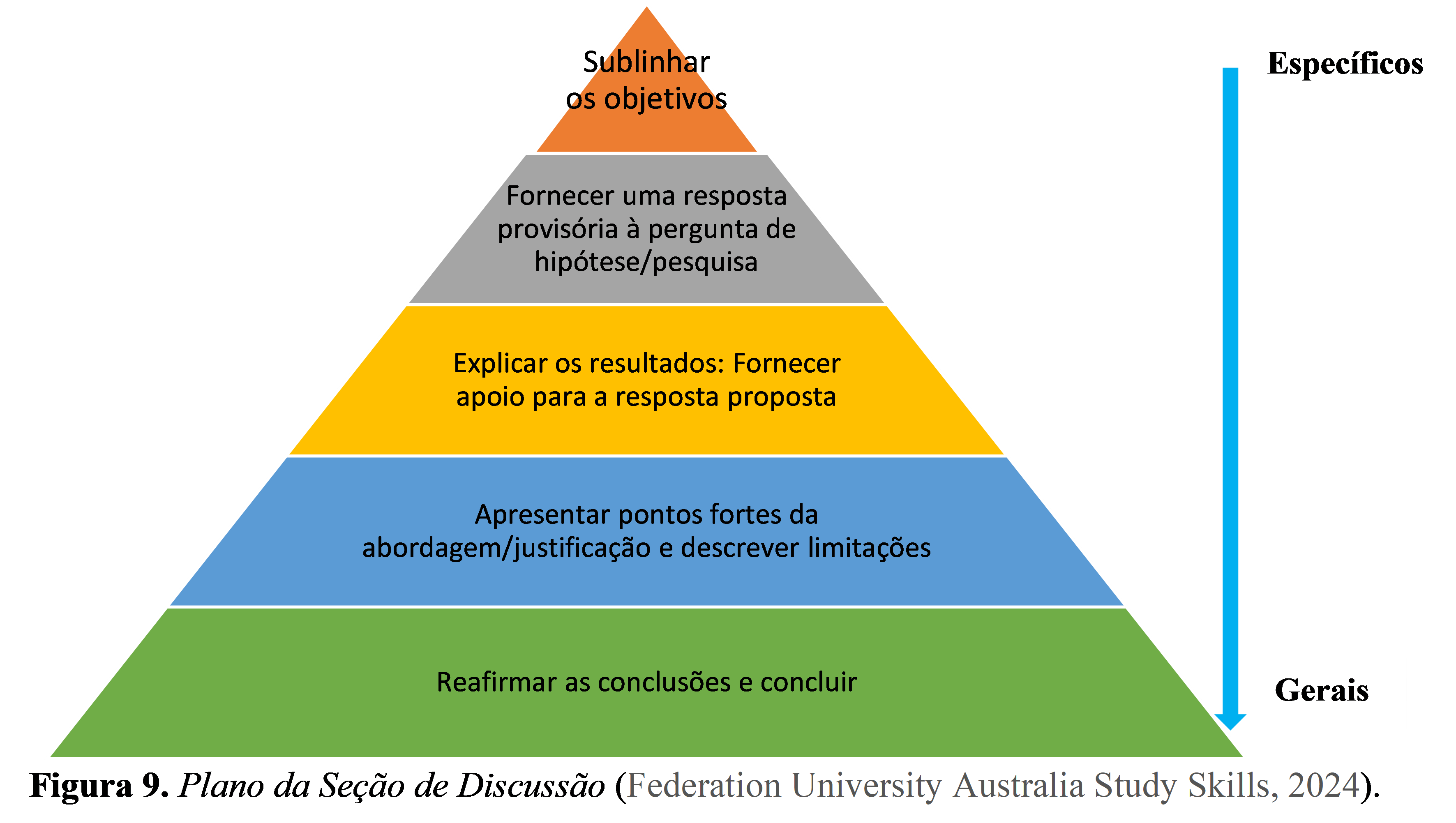 A Figura 9 descreve a conceção da secção de discussão. A secção de discussão na escrita académica assemelha-se a uma estrutura em forma de ampulheta, em que a base triangular se estende dos resultados específicos a implicações mais amplas e ligações à literatura relevante. Apresentada visualmente, a secção de discussão enfatiza a transição da análise detalhada para conclusões gerais e ligações à literatura relevante. Esta estratégia é recomendada como um triângulo que se estende desde os resultados específicos da investigação até às conclusões e recomendações mais amplas.