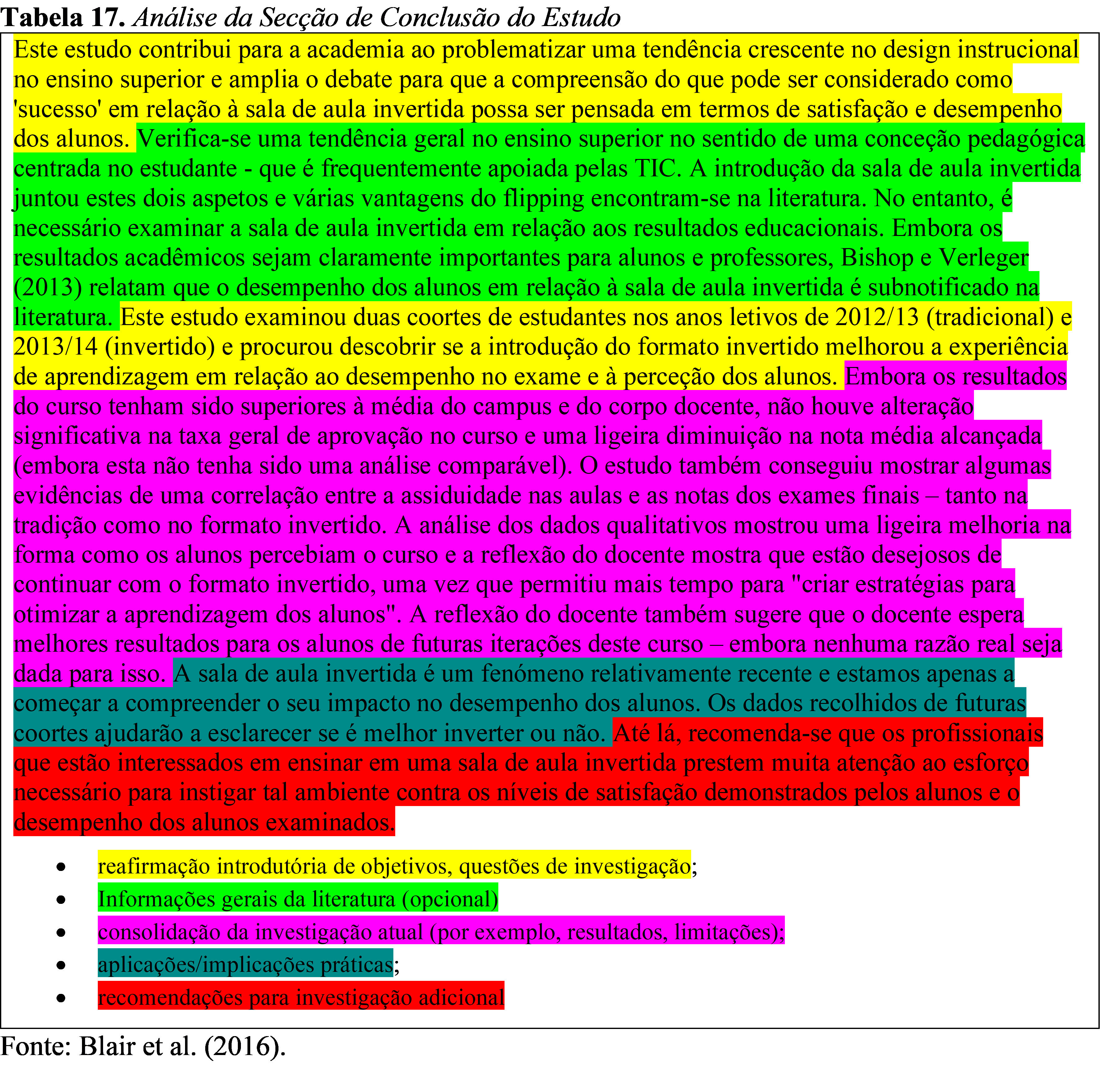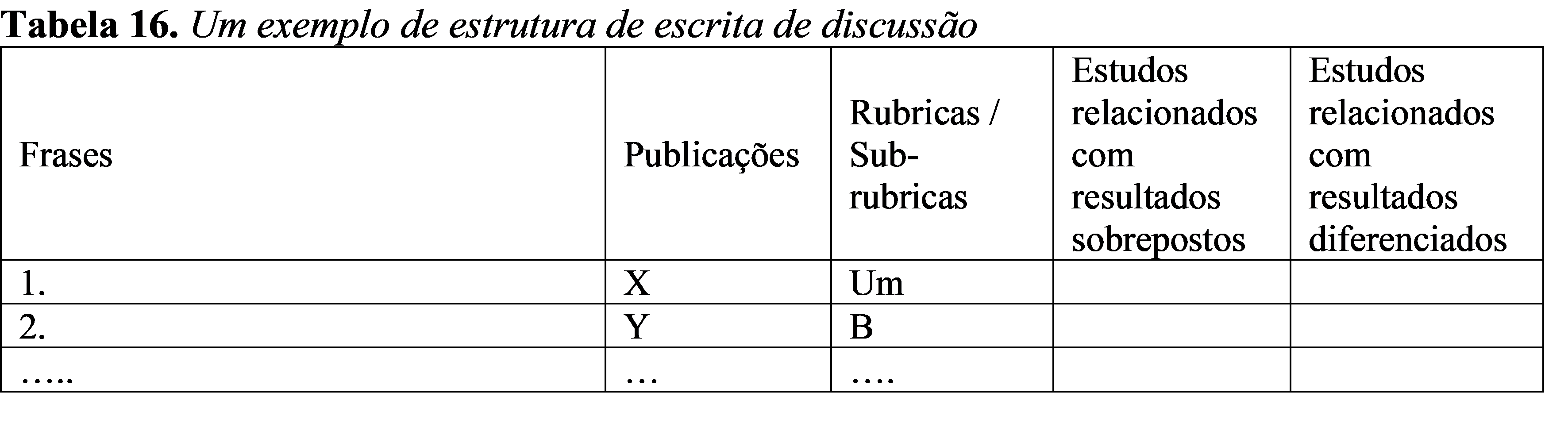 Este quadro pode ser concebido como na Tabela 16, uma vez que as secções de discussão visam discutir os resultados do estudo com estudos relevantes na literatura anterior. O exemplo da Tabela 16 inclui estudos associados a resultados relevantes, mas também especifica estudos associados a resultados diferentes.