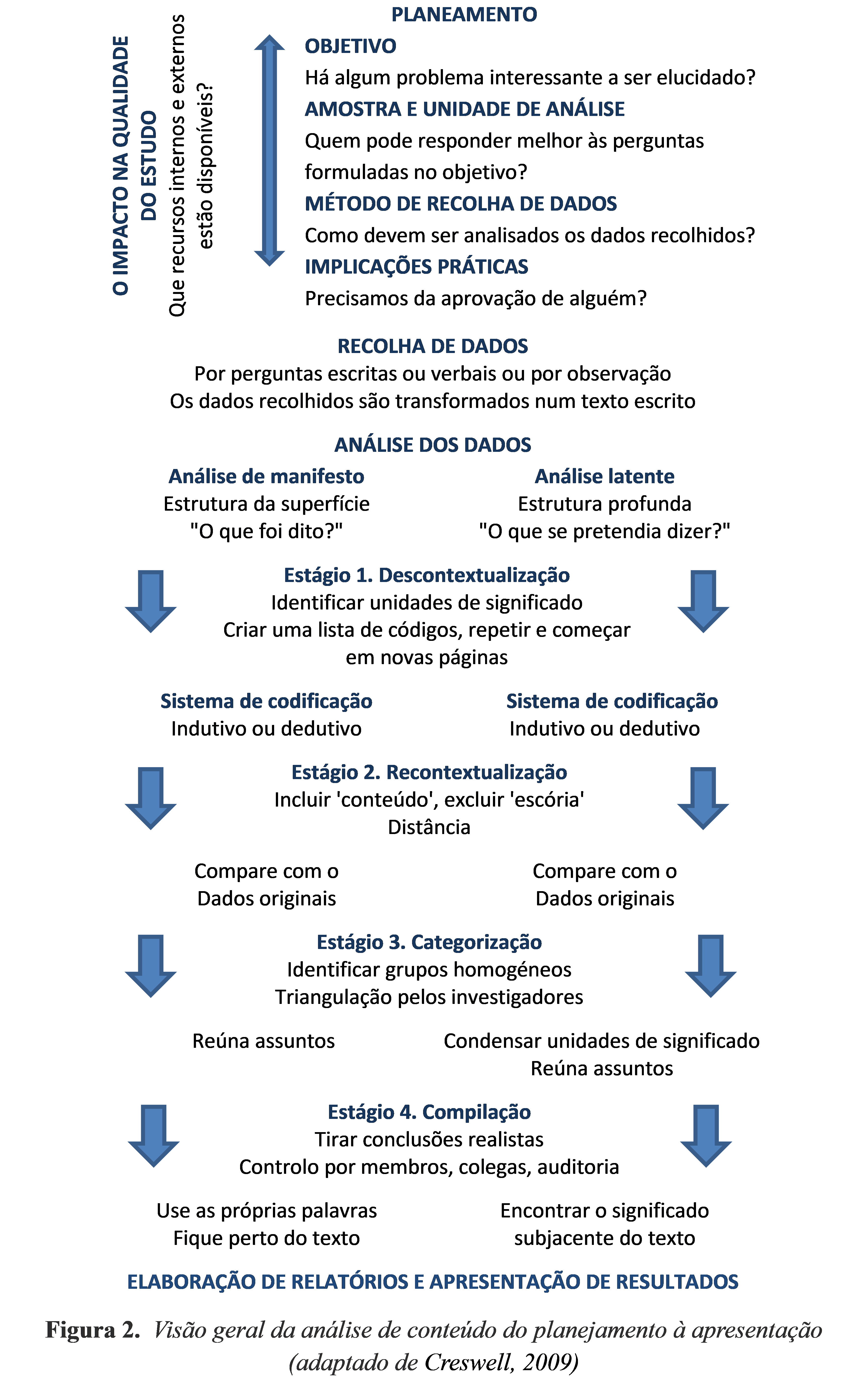 A análise de conteúdo compreende quatro etapas principais: descontextualização, recontextualização, categorização,e ainda compilação (Figura 2). No entanto, cada etapa tem que ser realizada várias vezes, a fim de manter a qualidade e confiabilidade da análise. É responsabilidade do pesquisador manter a qualidade do processo, garantindo validade e confiabilidade ao longo de todo o estudo, pois os resultados devem ser o mais rigorosos e confiáveis possível. Em um estudo qualitativo, validade significa que os resultados refletem fielmente os fenômenos estudados, e a confiabilidade exige que os mesmos resultados sejam obtidos se o estudo for replicado (Morse e Richards, 2002).