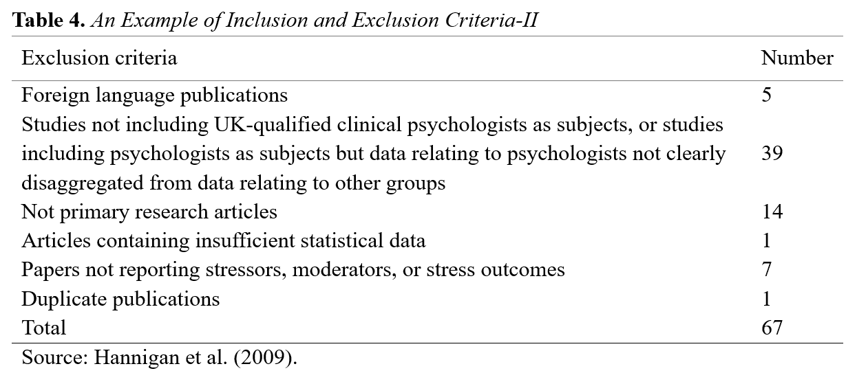 The tables below show various studies' inclusion and exclusion criteria (Hannigan et al., 2004; Murphy, 2019). It is essential to state the inclusion and exclusion criteria for all types of reviews regarding reliability and transparency. The way of reporting the criteria may vary depending on the researcher and the number of criteria. You may need to try several different search terms across multiple databases before finding a search strategy that can be replicated across your chosen databases (McGowan & Sampson, 2005).