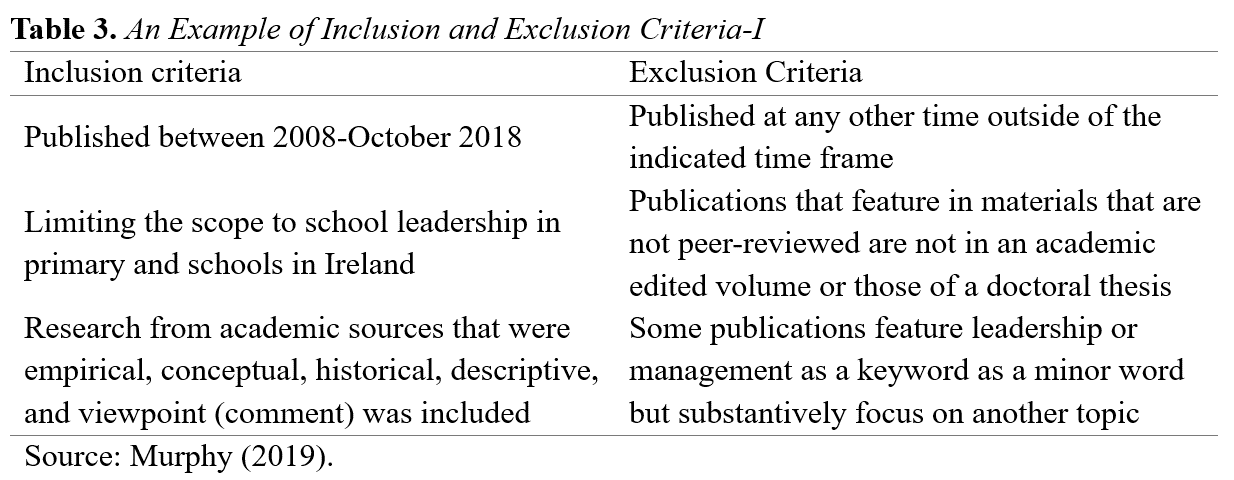 Researchers can limit the review to a specific type of research. In addition, other restrictions may be considered in terms of the country in which the research was conducted (e.g., only studies in Turkey), the characteristics of the participants (e.g., focusing on a specific age group), the setting of the research (e.g., within a university) and the study design itself (e.g., including only randomized control trials). The most crucial point to remember is that there should be defensible grounds for each criterion. For example, in a study restricted to one university, what distinguishes that university from others should be identified (Randles & Finnegan, 2023).