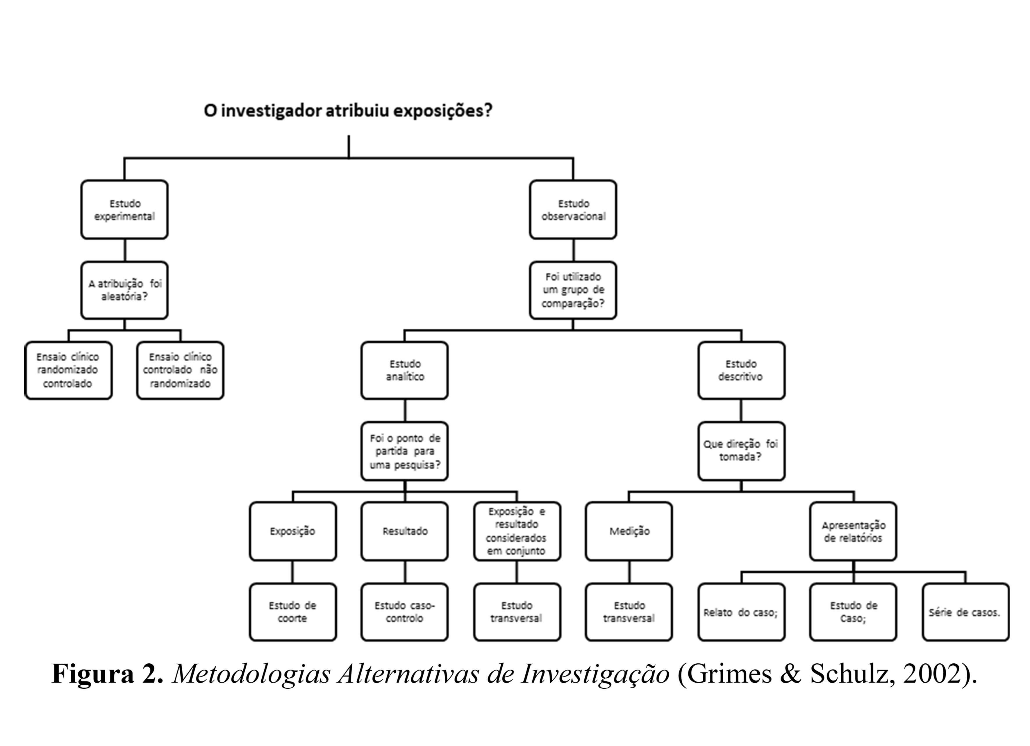 Grimes & Schulz (2002) formulou um quadro abrangente de metodologias de investigação alternativas que os investigadores podem empregar ao selecionar uma abordagem apropriada para o seu estudo, dependendo da sua questão de investigação e dos desafios inerentes ao seu desenho de investigação (Fig. 2).