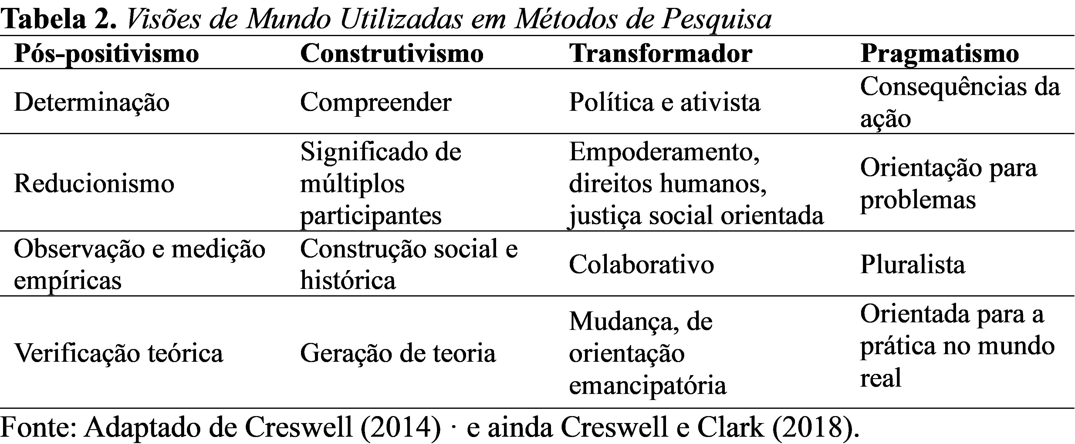 As principais visões de mundo são o pós-positivismo, o construtivismo, a advocacia/participação e o pragmatismo.