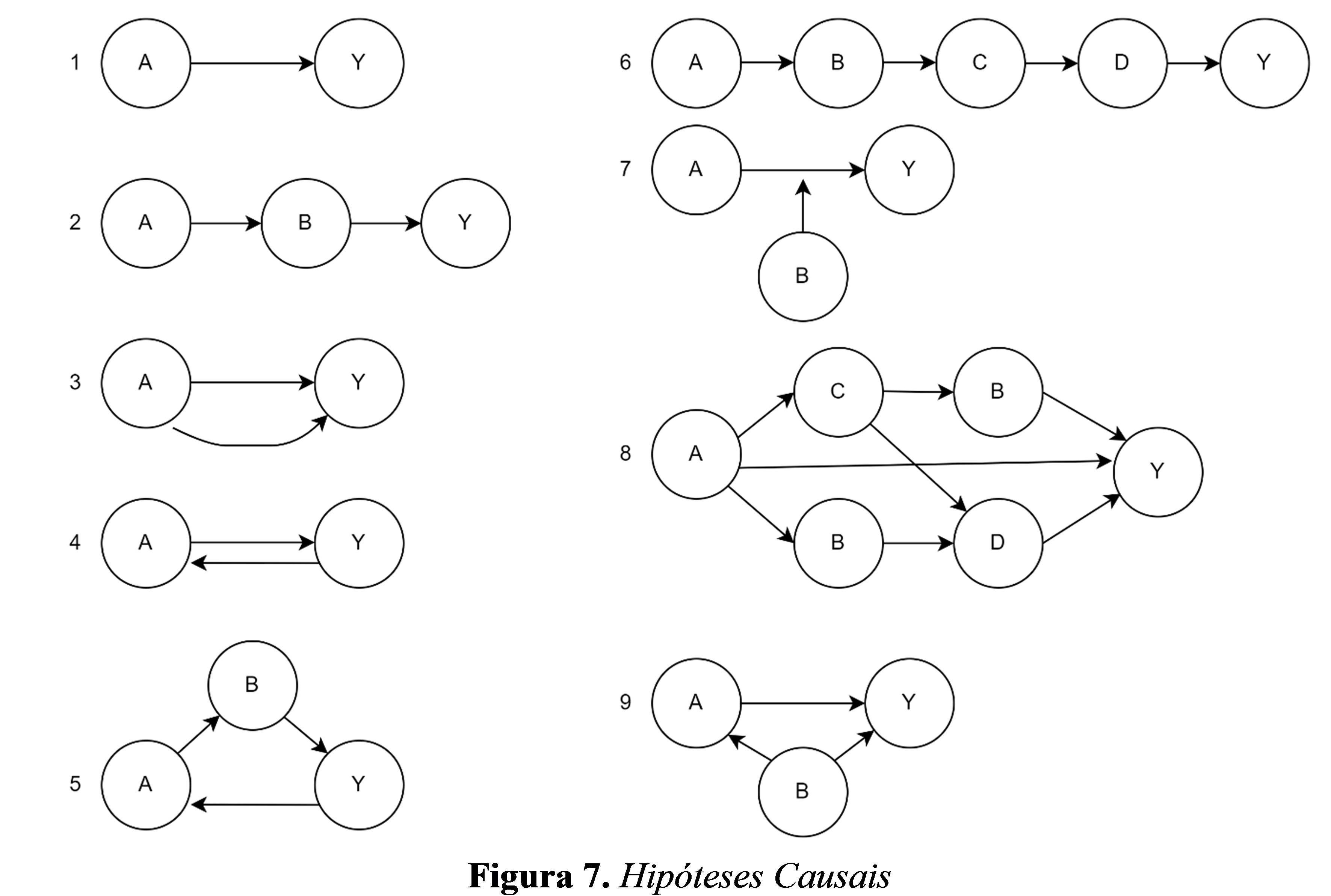 • Relação causal multi-mediada (dominó) em que A gera um desdobramento sequencial de efeitos ao longo do tempo em Y.