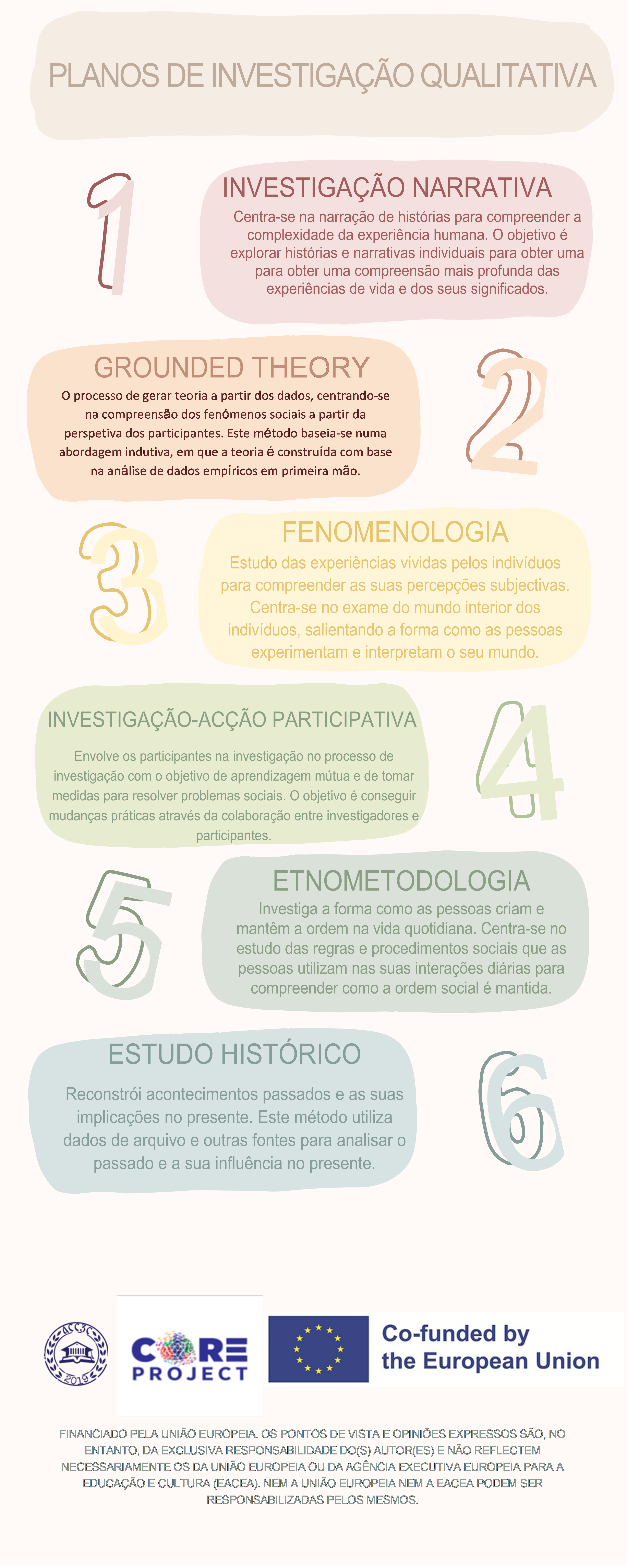 Alguns dos desenhos de pesquisa qualitativa mais comuns incluem: pesquisa narrativa, teoria fundamentada, fenomenologia, pesquisa-ação participativa (PAR), etnometodologia, e estudo histórico.