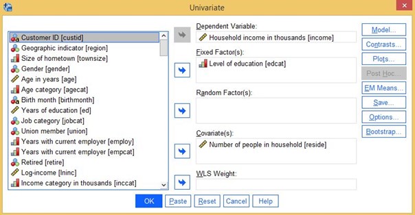 Selecione cada um dos fatores e covarie. Em seguida, selecione ambos à direita do que clique no botão de seta. Desta forma, você será capaz de analisar variável fatorial, covariável e seu termo de interação.
