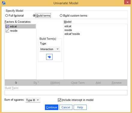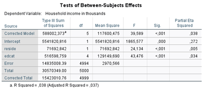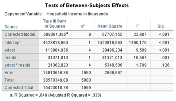 O que você precisa verificar na tabela de Teste de Efeitos entre Sujeitos é o Sig. (valor p) do termo de interação que é edcat*reside. Se o valor p for maior que 0,05, ou seja, insignificante, então seu modelo não viola a suposição de homogeneidade das inclinações de regressão. Neste exemplo, a suposição não é violada (uma vez que o valor p do termo de interação é 0,126, que é maior que 0,05), então podemos continuar a análise.