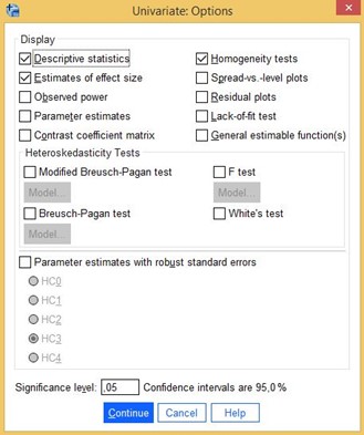 Depois disso, clique nas Opções... e selecione Estatísticas Descritivas, Estimativas do tamanho do efeito, Testes de homogeneidade e clique em Continuar... botão.