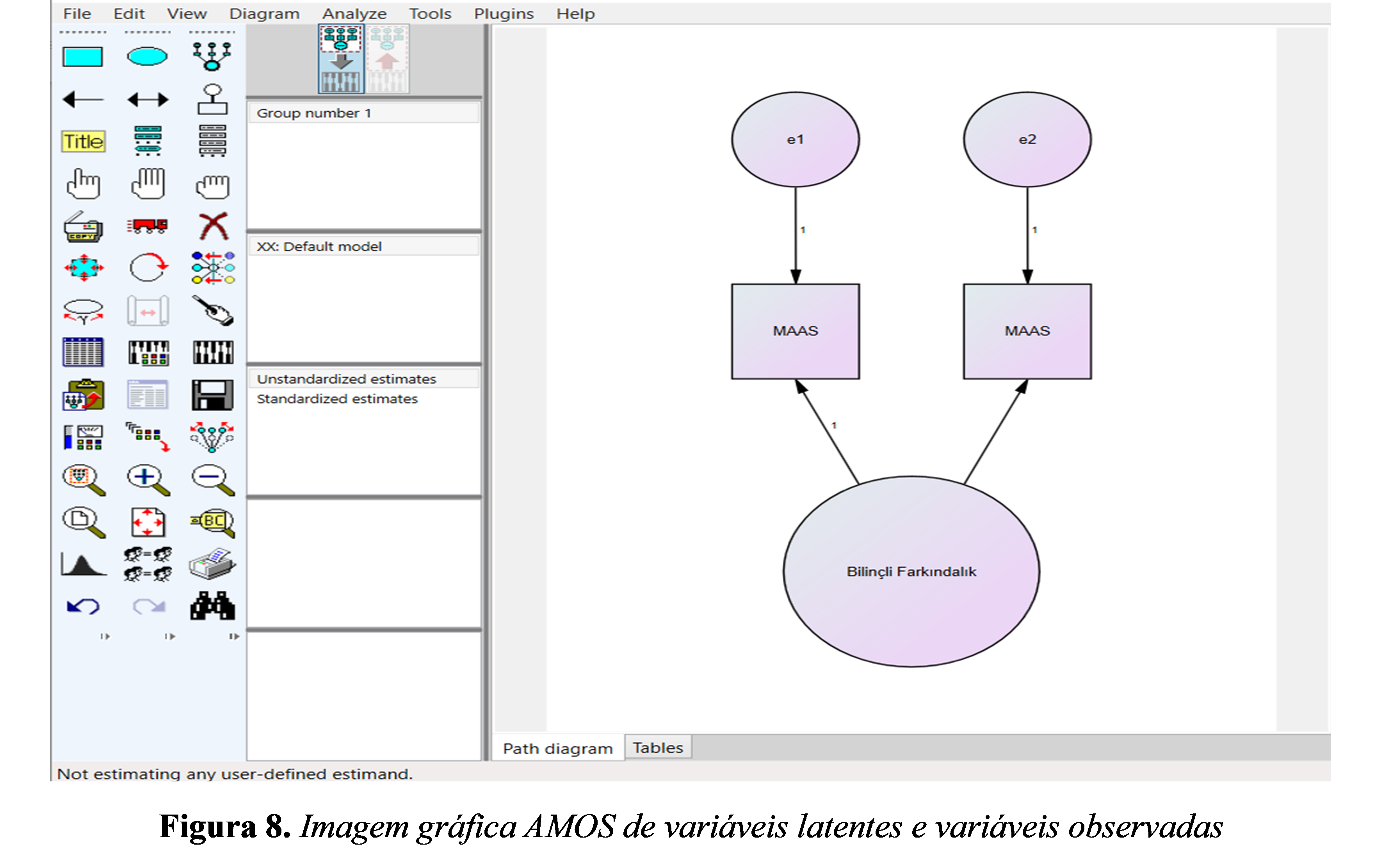 Na Figura 8, "Mindfulness" é a variável latente, "MAAS1" e "MAAS2" são variáveis observadas, "e1" e "e2" são valores de erro. De acordo com esta figura, a Mindful Attention Awareness Scale (MAAS; Castanho e Ryan, 2003; Özyeşil et al., 2011), que mede mindfulness, consiste em duas subdimensões determinadas pelo método de parcelamento: MAAS1 e MAAS2. De acordo com o número de variáveis latentes utilizadas no modelo, o diagrama é selecionado com o  ícone e copiado com o  ícone.
