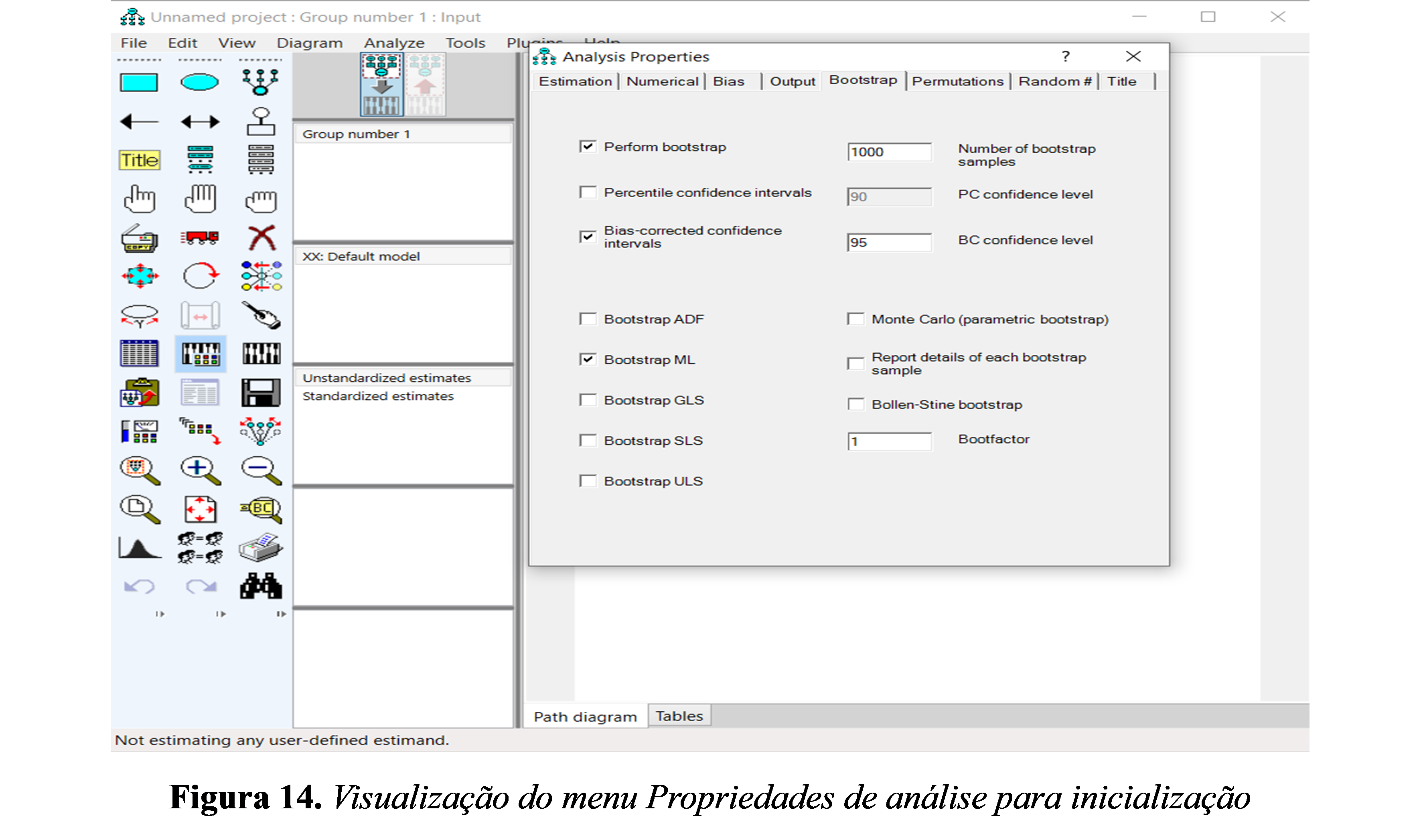 A última etapa da Modelagem de Equações Estruturais é determinar a validade do modelo. Um dos métodos mais comuns usados para determinar a validade do modelo estrutural é o método "Bootstrapping". O processo de bootstrapping consiste na reamostragem dos dados originais (Scharkow, 2017). Utilizando esta estratégia, podemos verificar a validade do modelo em amostras maiores. Para bootstrapping, o item de menu "Propriedades de análise" é aberto e a seção "Efeitos indiretos, diretos e totais" é selecionada.  Na guia "Bootstrap", as opções "Perform Bootstrap", "Bias-Corrected Confidence Intervals" e "Bootstrap ML" são selecionadas. Digite um número entre 500 e 1000 para a opção "Número de amostras de bootstrap" (Cheung & Lau, 2008). Este número representa o número de reamostragem do seu modelo. Escreva 95 para a opção "Nível de confiança BC". Assim, a análise é realizada com um intervalo de confiança de 95%. Depois de tudo ter sido feito até agora, clique no botão "Calcular Estimativas" e obtenha os resultados. Um exemplo de captura de tela do menu "Propriedades de análise" é dado abaixo.