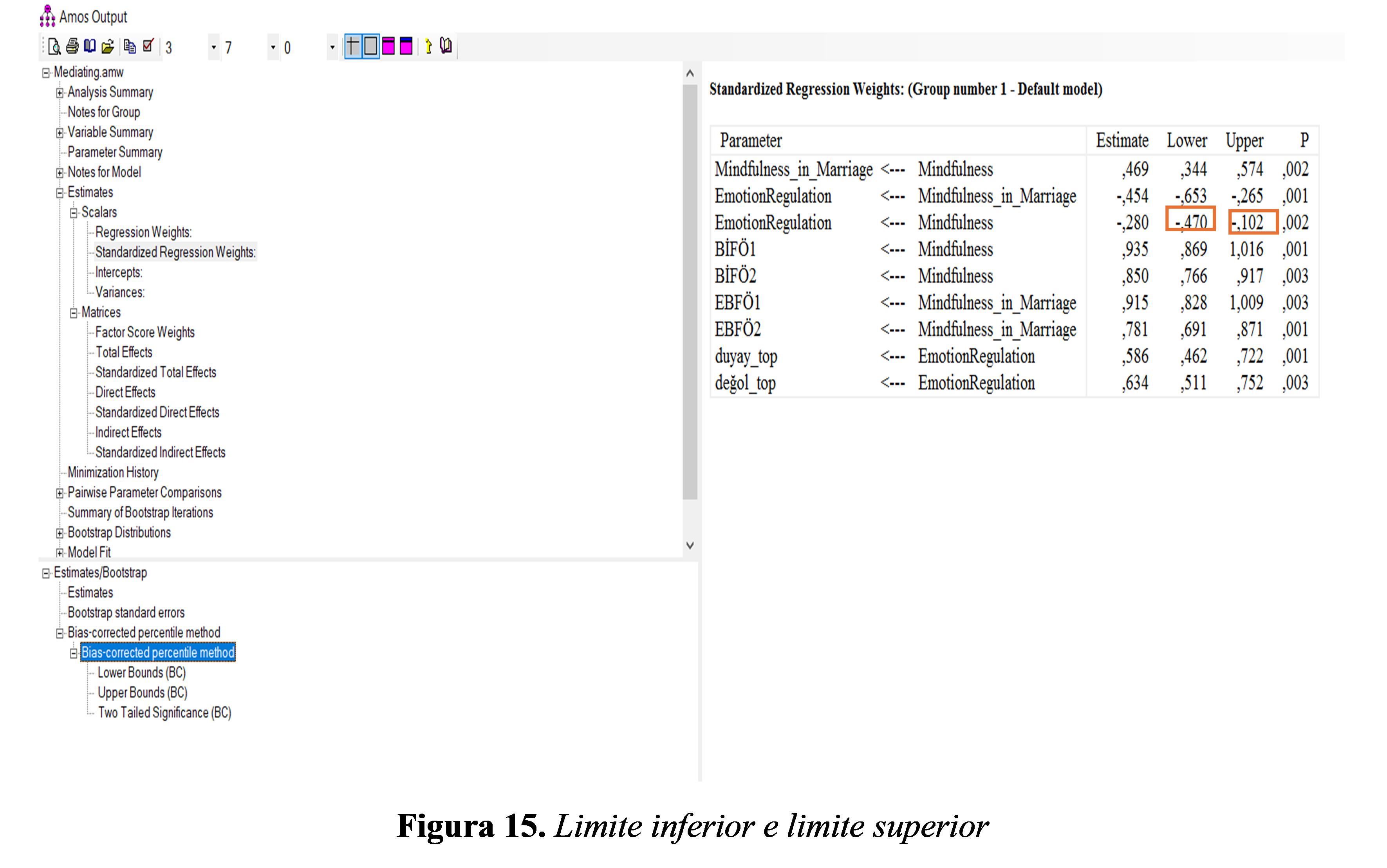 Na Figura 15, como nossa variável independente é "Mindfulness" e nossa variável dependente é "Emotion Regulation", quando olhamos para os valores de limite inferior (-.470) e superior (-.102) entre essas duas variáveis, vemos que não há zero entre elas. Assim, como resultado do bootstrapping, o efeito indireto no modelo estrutural é significativo em um intervalo de confiança de 95%. No final, todas as análises conduzidas no âmbito da Modelação de Equações Estruturais devem ser reportadas.