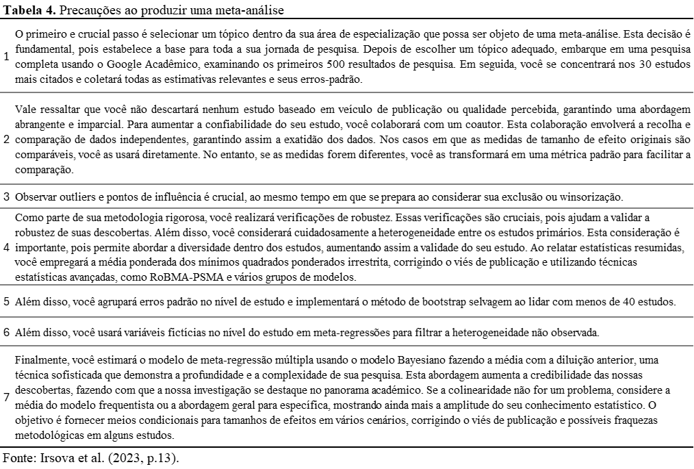 A Tabela 4 contém uma lista de verificação que você deve seguir ao realizar uma meta-análise para evitar a produção de conhecimento irrelevante.
