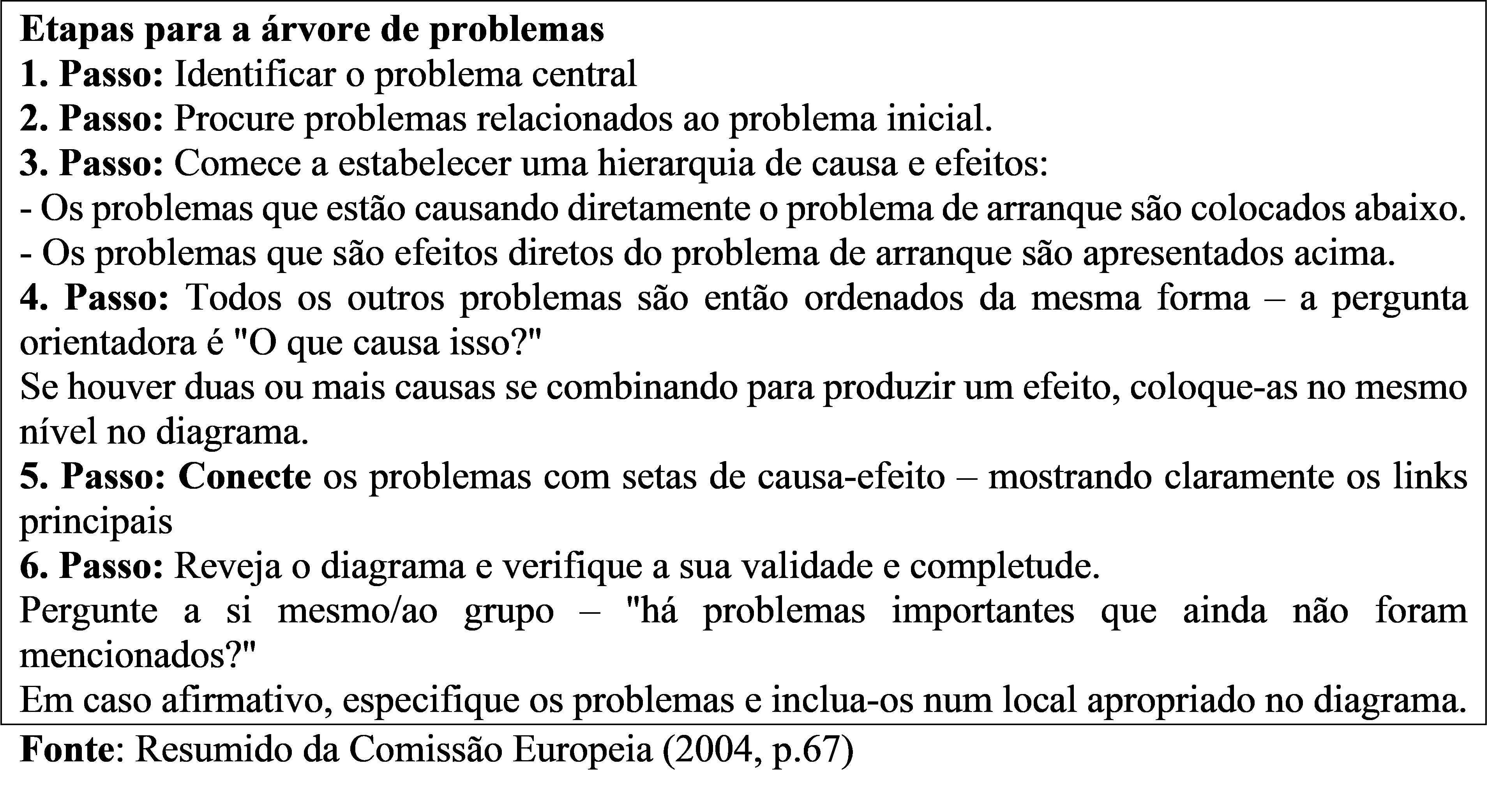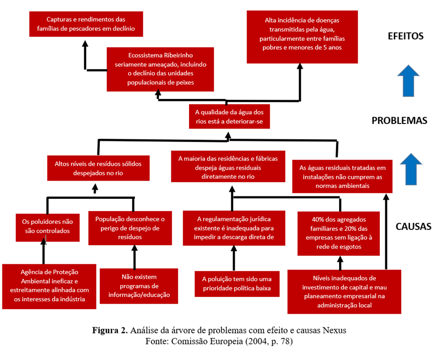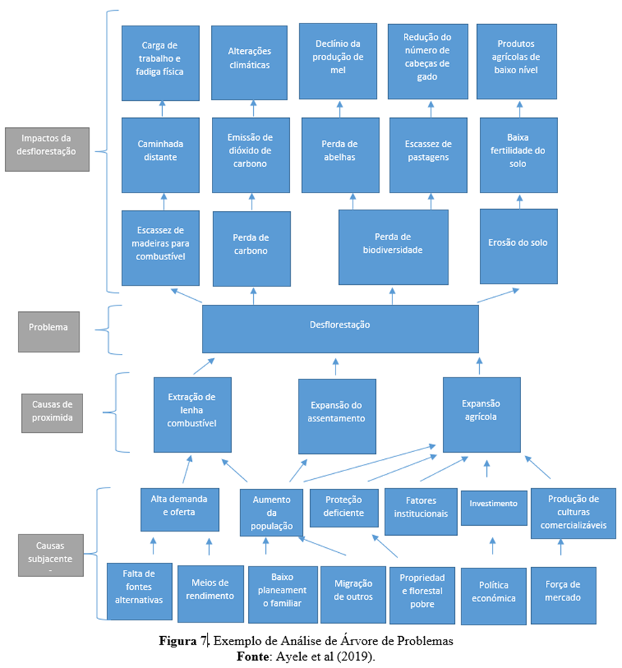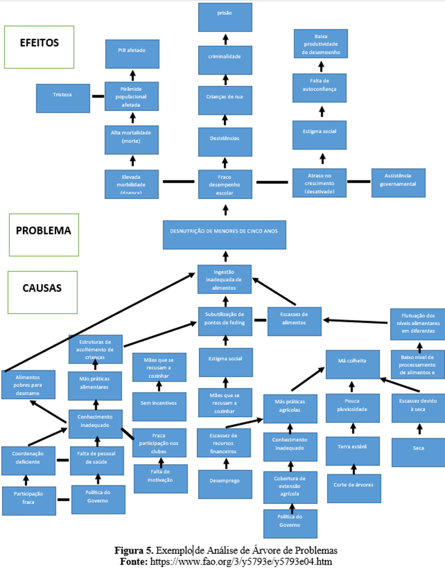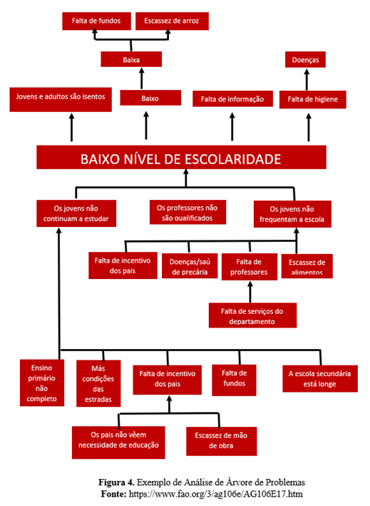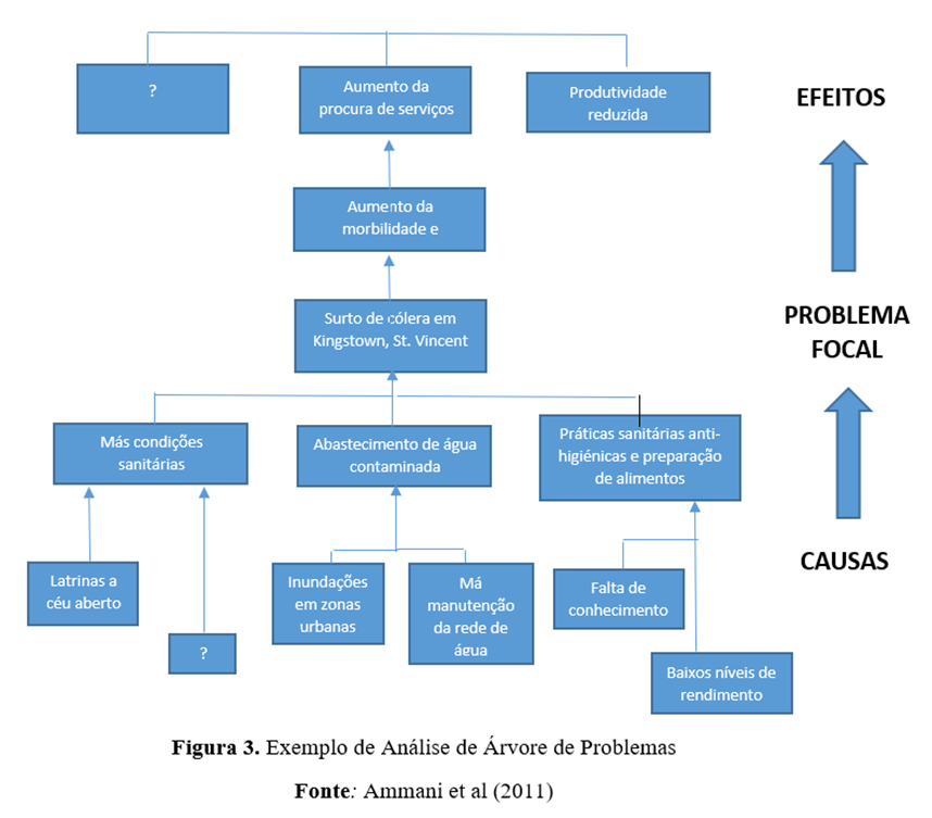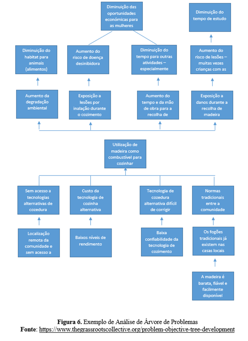 A análise da árvore de problemas (também conhecida como diagrama de causas-efeitos) é um método útil para ver as causas e os efeitos de um problema juntos e para criar metas e estratégias de acordo (Mahto e Kumar, 2008, p. 22-23). Permite também o trabalho em equipa e a criação de uma ordem hierárquica de problemas e efeitos. No meio da árvore de problemas está o principal problema ao qual o projeto pretende intervir. O seu principal problema no projeto, se resolvido, deve contribuir para o objetivo geral do projeto. Em outras palavras, o objetivo geral do projeto não incluirá diretamente um problema que você superará completamente durante o projeto, mas expressará uma situação geral visando uma situação negativa resultante dos efeitos desse problema. Por exemplo, se identificou o desemprego dos jovens como o principal problema do seu projeto, todos os objetivos e atividades para combater esta situação contribuirão para a consecução do objetivo global. Por conseguinte, o seu projeto contribuirá, em certa medida, para o objetivo geral, abordando este problema.